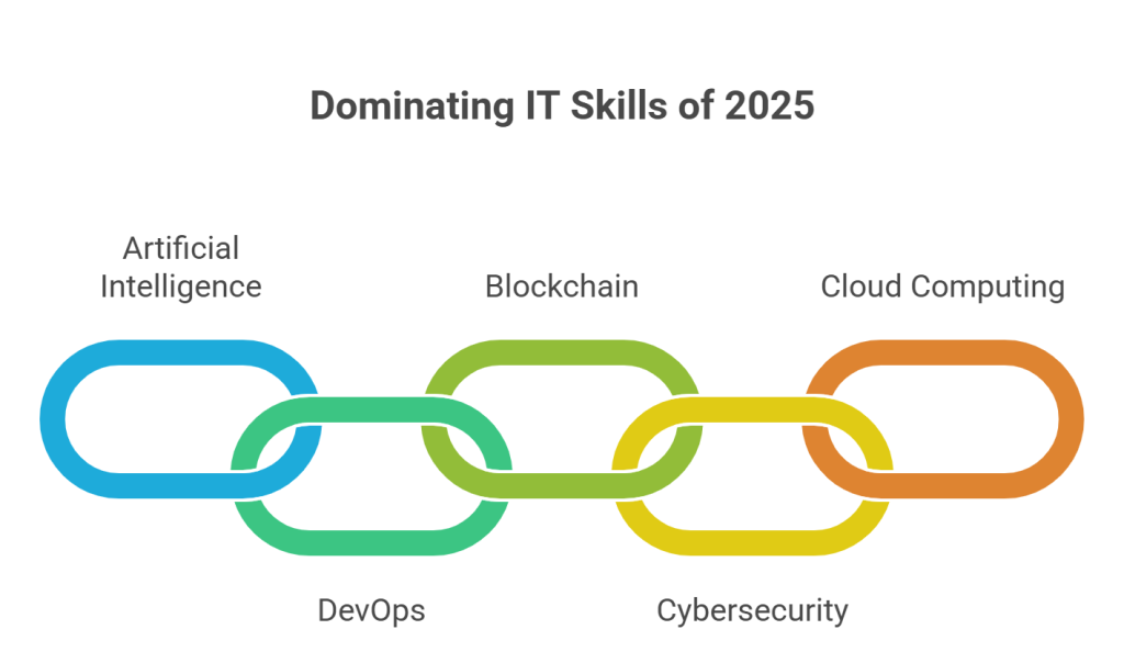 The top five IT skills dominating in 2025 are Artificial Intelligence (AI), DevOps, Blockchain, Cybersecurity, and Cloud Computing. These aren’t just buzzwords; they represent high-impact capabilities that redefine business agility and resilience. Companies across sectors—from finance and healthcare to logistics and retail—are aggressively recruiting talent fluent in these technologies to ensure scalability, security, and smart decision-making.