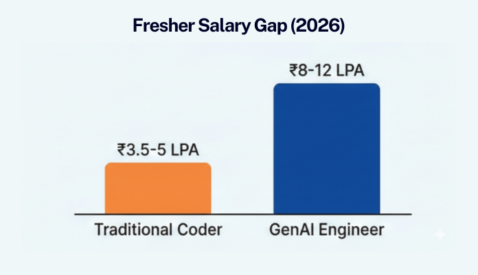 In 2026, GenAI freshers in India command packages between ₹8 LPA to ₹12 LPA in Tier 1 cities, while traditional roles hover around ₹3.5 LPA to ₹5 LPA.